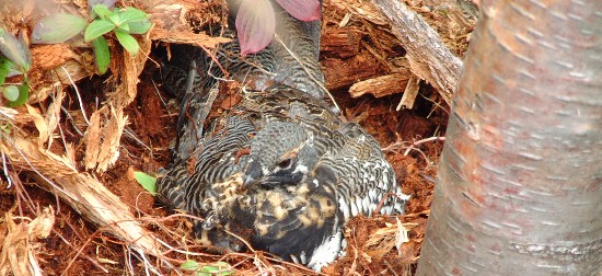 La descente nous gratifie de traces de la faune locale. Mais à bien y réfléchir je préfére avoir seulement vu empreintes et déjections, car la rencontre avec l'ours aurait peut être était périlleuse. Mais un peu plus bas une surprise nous attendait. Non ce n'était pas l'orignal, mais seulement une famille de colin de virginie qui nous a laissé filmer et photographier en toute tranquillité, puis ils ont disparus dans les fourrés à la recherche de nourriture.Colin dans le parc national de Gaspésie