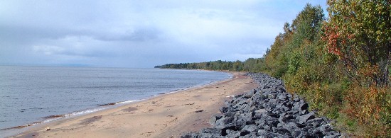Encore une journée grise humide fraîche et ventée. A la suite des fortes pluies de la veille, toutes les rivières (et dieu sait s'il y en a) sont devenues de véritables torrents boueux et se déversent avec fougue dans un Saint Laurent houleux. La fin de journée est plus clémente et nous trouvons un coin bien tranquille pour passer la nuit sous la garde bienveillante du phare de la Pointe-au-PèrePointe-au-Père