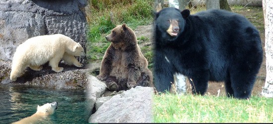 Nous poursuivons notre chemin vers le Lac-St-Jean,. Nous programmons une ballade dans le parc de la pointe-Taillon pour y voir orignaux et castors. Une petite pluie fine et froide abrégera notre randonnée. Point d'orignal, et des castors nous ne verrons que leurs huttes et leurs barrages. Mais il faut avouer que ces ouvrages sont à voir, car ils témoignent de la grande intelligence de ces animaux architectes et aussi bâtisseurs. Le lac est immense (+ de 1000Km²) une véritable mer intérieure. Nous en faisons le tour pour rejoindre le zoo "sauvage" de Saint-Félicien.Ours polaires Grizzly Ours brun