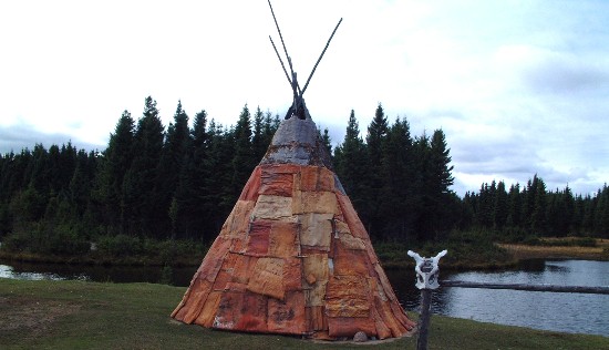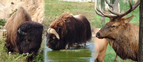 Puisqu'il ne nous a pas été donné de voir la faune sauvage dans la nature, nous nous décidons à visiter ce zoo. Un seul mot : MAGNIFIQUE. Nous qui aimons bien voir les animaux dans leur milieu naturel (voir onglet sur le Niger & Madagascar) nous partions avec un à priori négatif. Mais la visite, à bord d'un petit train grillagé, au milieu d'animaux en semi liberté (le parc fait tout de même 600 hectares) nous a enthousiasmé. Les animaux bien sur, mais aussi la reconstitution d'anciennes habitations et surtout les commentaires avec l'accent très prononcé et les expressions locales, c'était un vrai régal. A en oublier le temps maussade et froid.Wigwam dans le zoo de St-Fékicien