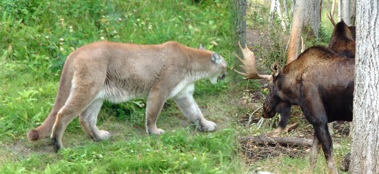 Dans des enclos particuliers nous admirons un imposant grissly,un couple d'élégants et puissants couguars, un lynx indifférent, des ratons laveurs endormis des renards afférés et beaucoup d'autres animaux locaux.Cougar Orignal